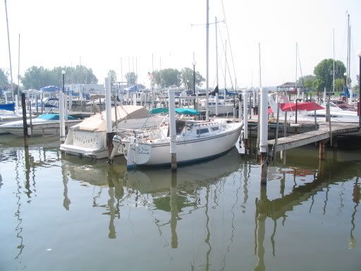 Hi All, below is a pic of La Tina Caliente in her new slip. I am taking the picture from the dock leading out to the boat. I have to back out of the slip and towards the dock to get out of the marina. You can see that I do not have much room at all for manuvering. So, I sent away for a product package from EZ Steer. In this case it is a must have.....but, unfortunatly I do not have the extra money to buy it ($200.00 at Cabelis). So I started looking around the shop for some bits that I might be able to fabrecate into a steering system. This spring I replaces the pintals on the rudder and looking at the old ones, I realized that I could mount one on the back of the rudder with the pin pointing up and strap the other one on the back of the outboard with the pin pointing up and make a rod to go between them. I will post pics when I get it hooked up. Cheers.