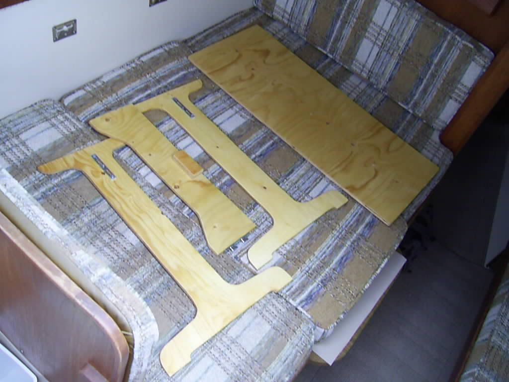 So this is what I ended up doing. Simple but handy. All the parts goes in the cockpit locker when not use. And the table top is also used for an extra full size bed.
