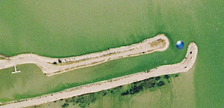 Here's a re-creation of what I saw on the cell phone. Note that it is zoomed out a bit so you can see the whole marina (with it's one small dock :) The blue dot marks your position on the image. Winds were from the northwest-ish (upper left of photo) and my gps coordinates put the opening somewhere along the lee shore. "Shore" is putting it kindly. It is more like the "lee-battlement-of-hull-crushing-angry-concrete-slabs Shore".