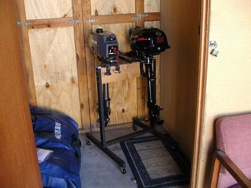 I made a motor rack out of 2x4's, 1x4"s, and 2x6's to hold 2 motors. It is 36" wide and 35" tall, excluding casters, and to accommodates our new 25" shaft 9.9 Nissan. Cross brace feet at the bottom are 24" long 2x4's. I put the casters on one end so I could wheel it around, when necessary, and 2x4 blocks on the other end to level it, almost. The cross bars at the top and bottom are 2x6's with vertical 2x4's between them, held together by vertical 1x4's top to bottom on each side. All done with nails and wood glue.