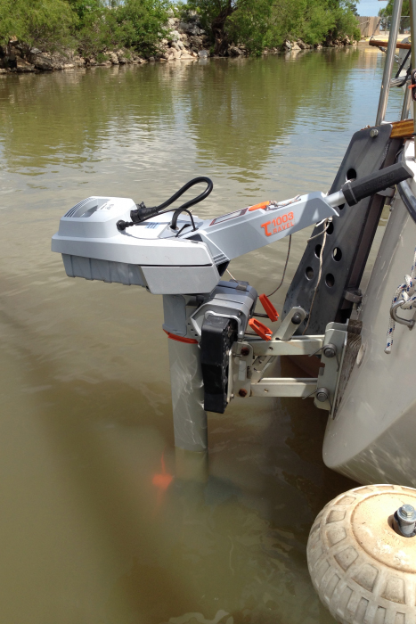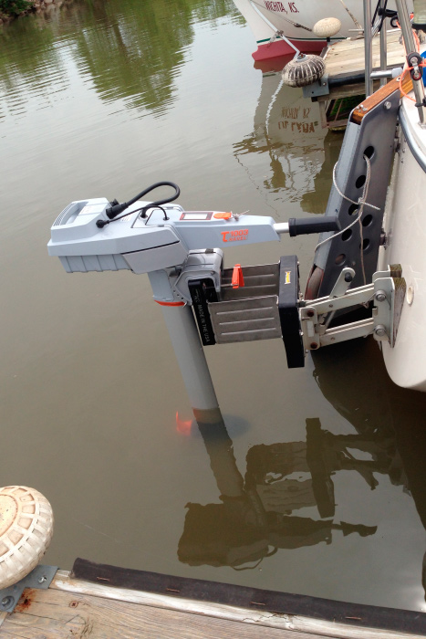 FINALLY we had a dry day to launch and I got to try my new Torqeedo. It does not fit well. They are designed with a tender in mind, intended for a transom hung position, not a motor mount position. By being on a motor mount the mechanism of the mount interferes with tilting while the battery and tiller are in place. The tiller is too long when in the run position. My fix was to move the motor out on an additional rigid mount.