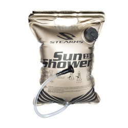 strap to the mast when the sun is out will heat it up in 2-3 hours; if sun does not cooperate or you are in a hurry warm up a gallon water on the stove, pour into sprayer and off you go; works much better then the gravity fed blatters; a friend of mine made a shower stall in the cabin of a Hunter 22 with a curtain attached to a home depot plastic shower pan; takes a shower down below in comfort then picks up the pan and dumps the water into the cockpit - his wife likes it a lot (sorry, no pictures).
