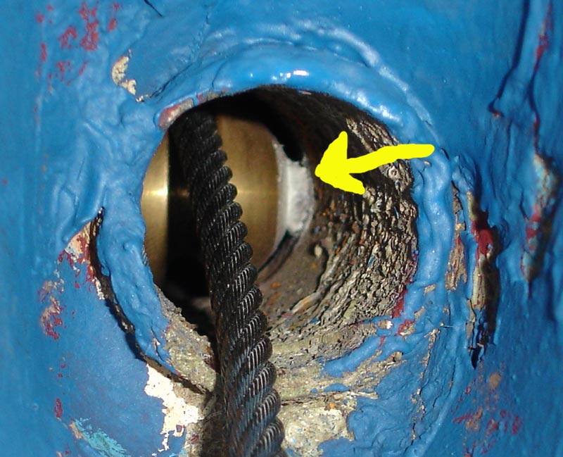 I am very sorry this picture is so pourly focused; that said, this shows a cable that has worn completely through the ball and had begun wearing on the stainles pin. I think it would have taken a while for it to get through the pin. But it did change the exit angle so the cable was chewing a groove where it exits the "pipe". Your entire area looks rough, maybe it is what that area looks like on saltwater boats. Your comment about replacing "all of your swing keel hardware" has me confused, the cable does not look new. Anyway, I would not worry too much about it until your next opportunity to haul as long as that is sometime this season